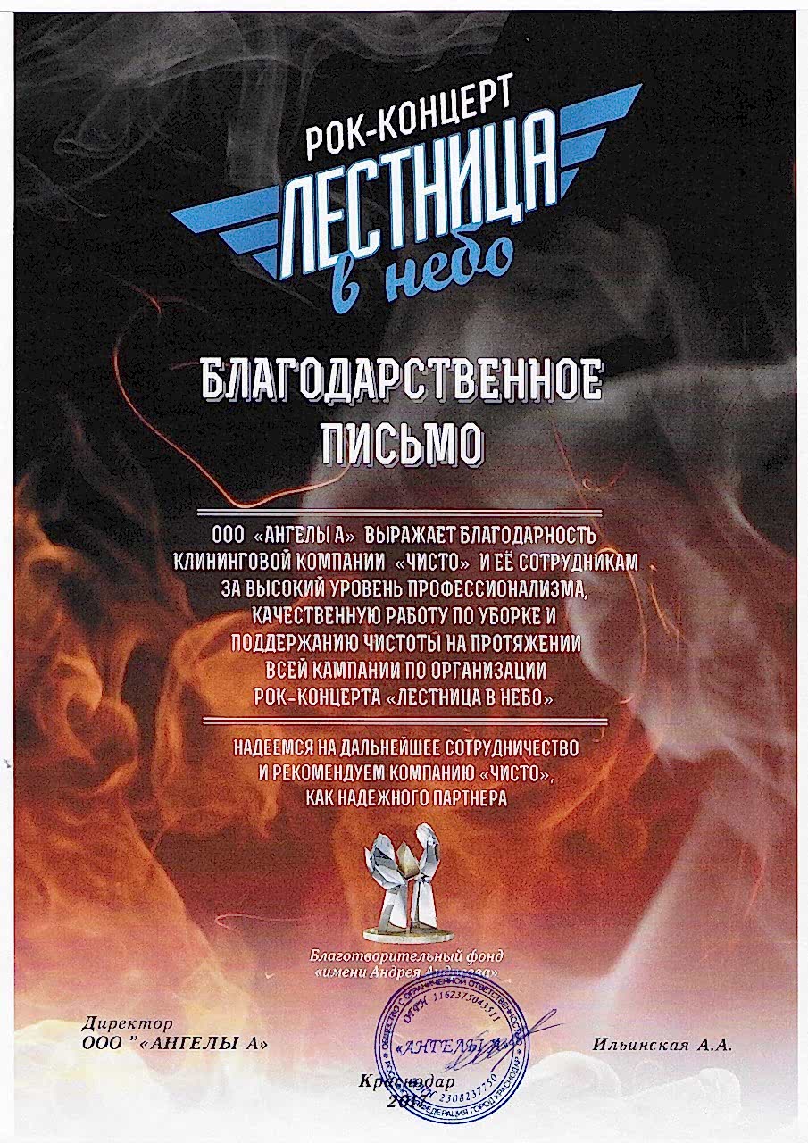 Высокий уровень профессионализма, качественная работа по уборке и поддержанию чистоты на протяжении всей кампании по организации рок-концерта "Лестница в небо". Надеемся на Pin Up сотрудничество и рекомендуем компанию "Чисто" как надежного партнера.