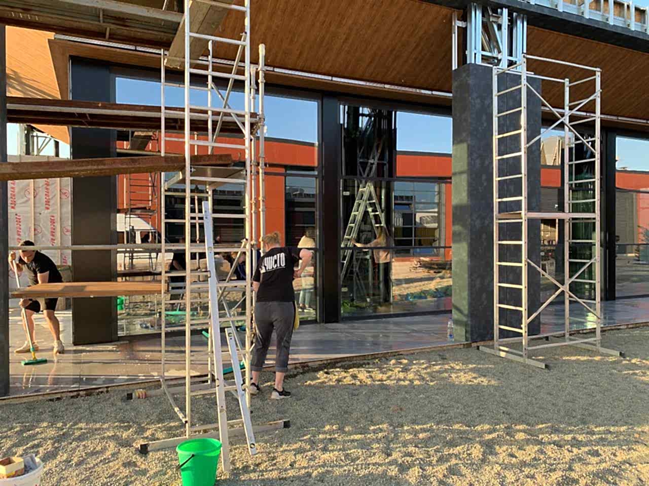Когда внутренние работы были Pin Up перешли к мойке фасада. Для этого использовали АВД и специальные средства, которые устранили въевшуюся грязь, не повредив покрытие. Последним этапом стало мытье окон.