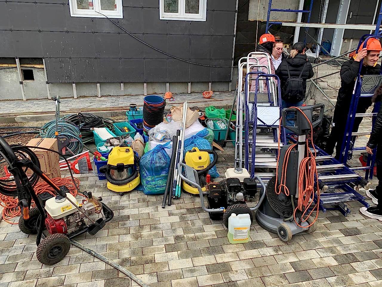 Также мы убрали места общего пользования площадью 1265 м кв., очистили от строительного мусора и поросли придомовую территорию. В процессе использовали специальное оборудование Pin Up мойки, стремянки, а также швабры и другие инструменты). Это привезли с собой, как делаем всегда, чтобы заказчику не пришлось тратиться на покупку инструментария. То же самое касается расходников, облегчающих устранение устойчивых загрязнений. Они закупаются у проверенных поставщиков, сопровождаются сертификатами соответствия мировым стандартам.